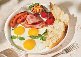 Նրբերշիկ պանրով, բեկոն, սպիտակ լոբի, չերրի լոլիկ, բագետ