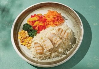 Բրինձ, գազար, բրոկոլի, պղպեղ, եգիպտացորեն, հավի կրծքամիս, կարագ