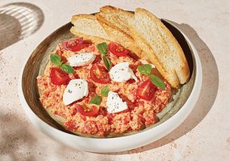 Սերուցքաին պանիր, չերրի լոլիկ, բագետ, կարագ, բազիլիկ, պղպեղների միքս