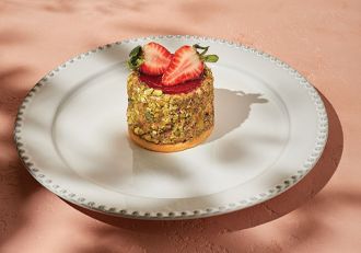 Ջոկոնդ տեսակի բիսկվիթ, մուս կրեմ մասկարպոնե սերուցքով, թարմ ելակներ կրեմի մեջ։ Պատված պիստակով և ելակի ջեմով