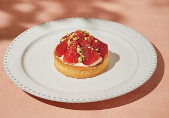 Շաքարե փխրուն խմոր, վանիլային կրեմ։ Վրան ավելացվում են թարմ ելակներ