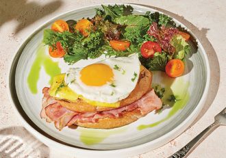 Ձու, բատոն, բեկոն, բեշամել սոուս, չեդեր, չերրի լոլիկ, կանաչիների միքս