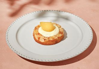 Նուշի և ն ալյուրի հիման վրա պատրաստվա խմոր, կրեմային զանգված։ Ֆրանջիպան կրեմ, նուշի թերթիկներ, վանիլային կրեմ, սպիտակ կիսաչոր գինով հարբեցրած մոնո տանձ։