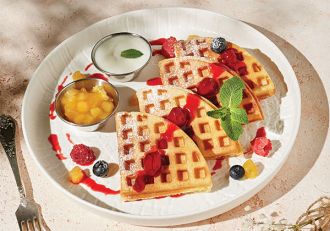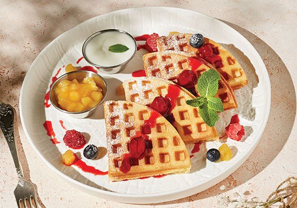 Վաֆլի, մանգոյի խյուս, հունական յոգուրտ, հատապտուղներ, բալի սոուս