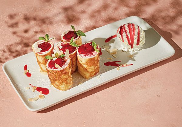 Ռիկոտտա, սերուցք, բալի սոուս, նուշի թերթիկներ, ջելատո