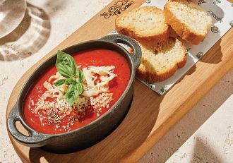 Լոլիկ, հավի արգանակ, սերուցք, սոխ, սխտոր, պարմեզան, գաուդա, բազիլիկ