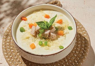Հավի կրծքամիս, հավի արգանակ, բանջարեղեն, նյոկի, սերուցք, պարմեզան, բազիլիկ