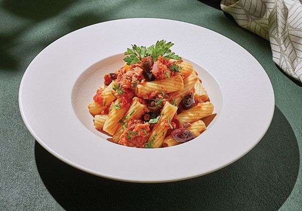 Թունա, կալամատա ձիթապտուղ, լոլիկի սոուս, սոխ, մաղադանոս, ձիթայուղ