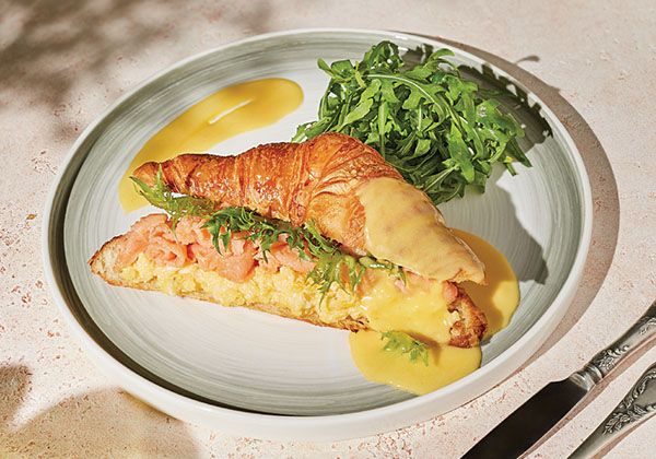 Ձու, սաղմոն, հոլանդես սոուս, կրուասան, ռուկոլա