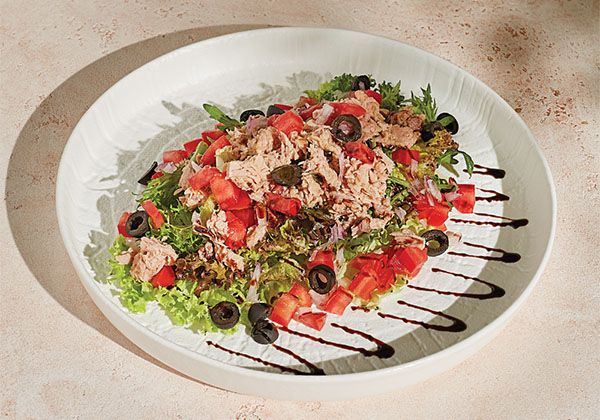 Թունա, սոխ, լոլիկ, կանաչիների միքս, բալզամիկ սոուս